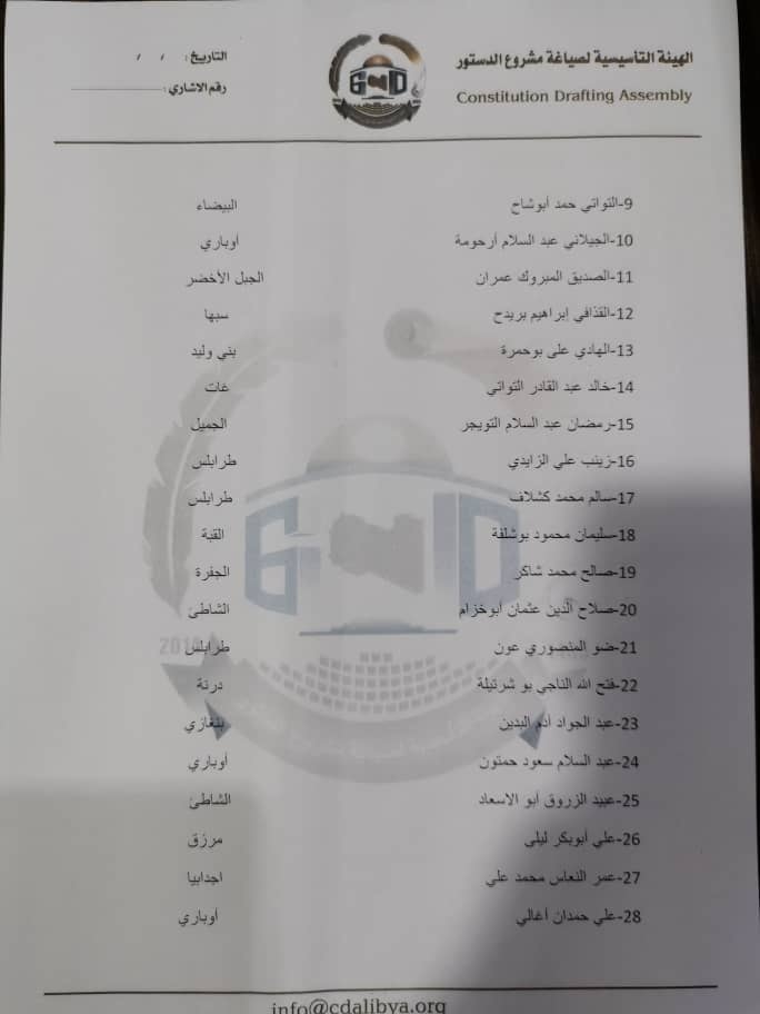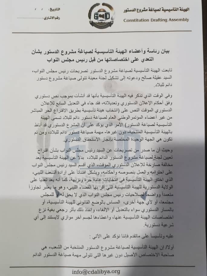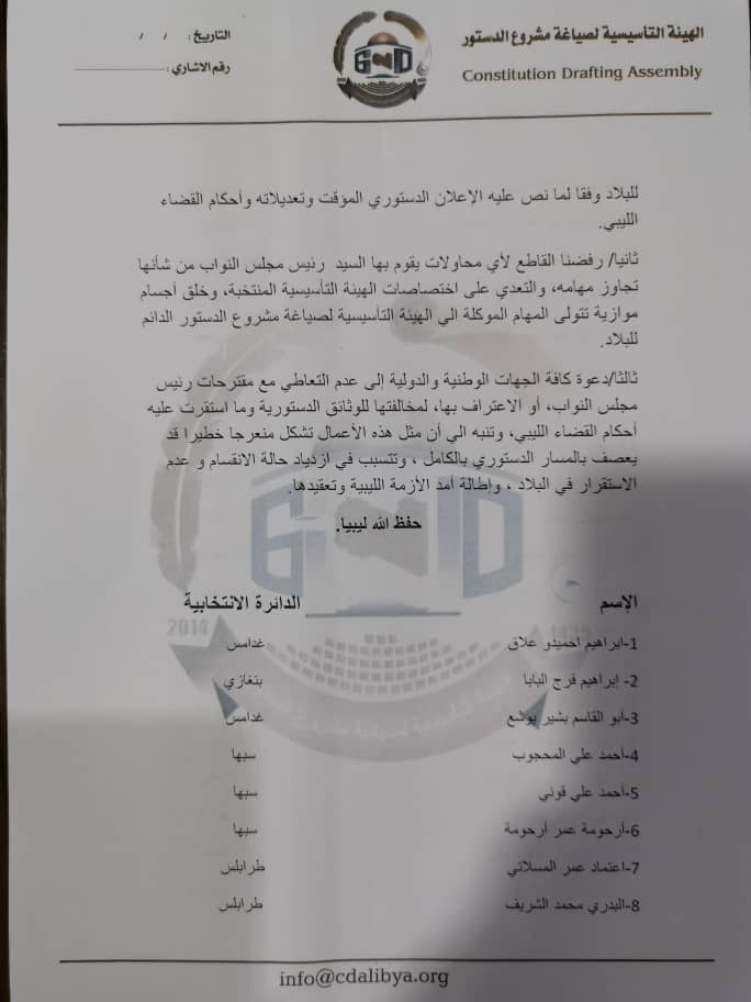 43 members of the Constitution Drafting Assembly released on Wednesday a joint statement in which they rejected a proposal of Parliament Speaker, Aguila Saleh, to form a committee to work on another draft for the constitution.
