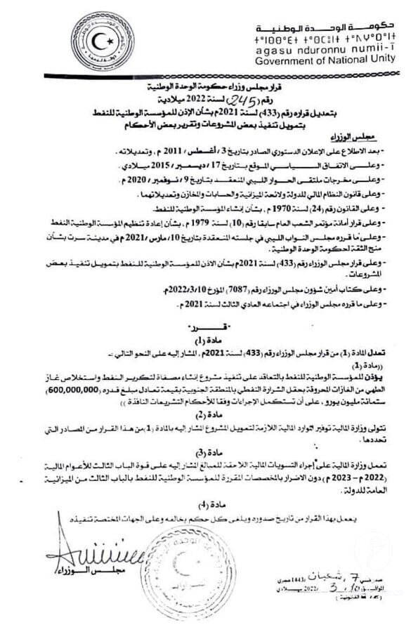 The project, which is worth 600 million euros, will be implemented by the state-owned National Oil Corporation (NOC) and funded by Dbeibeh’s ministry of finance.