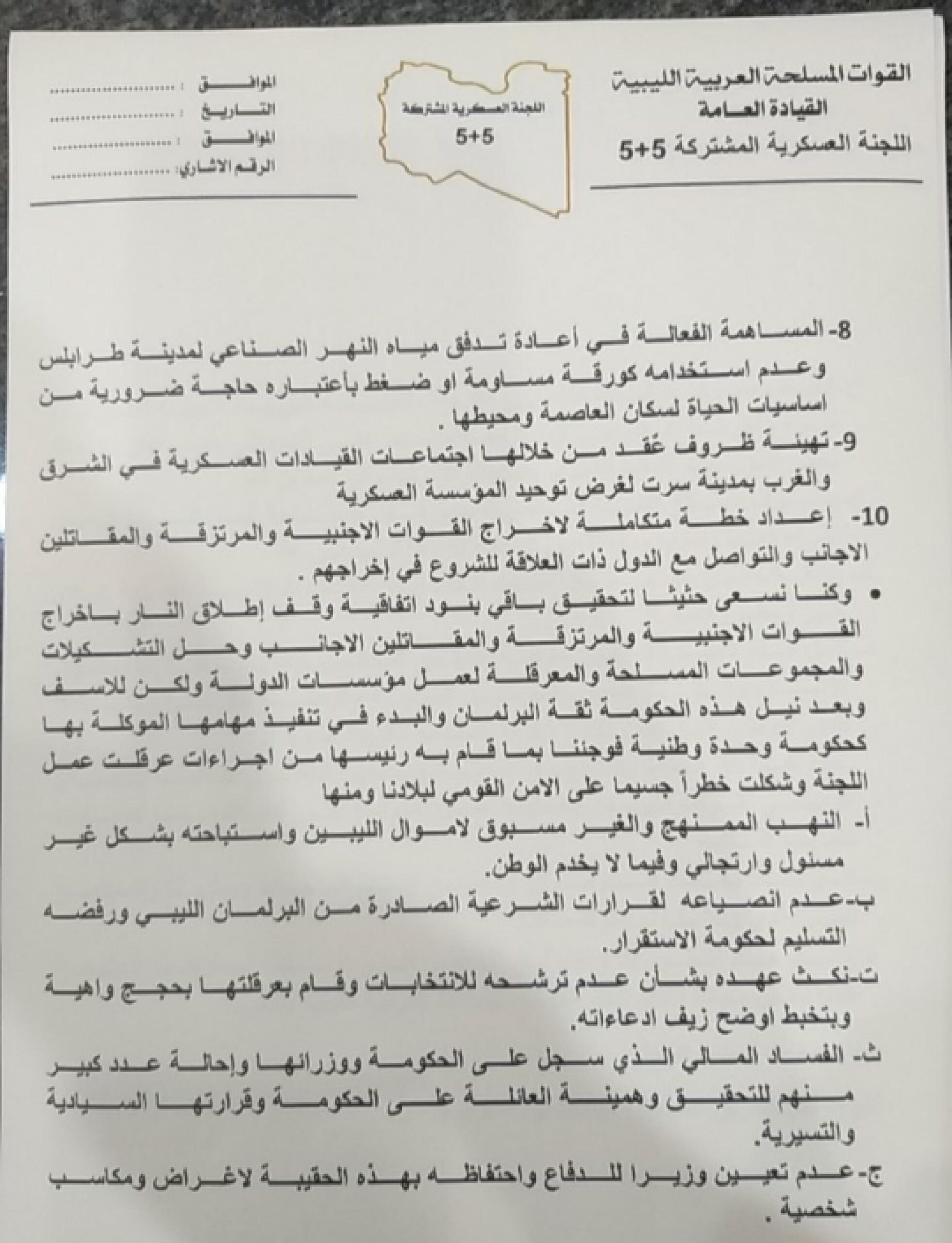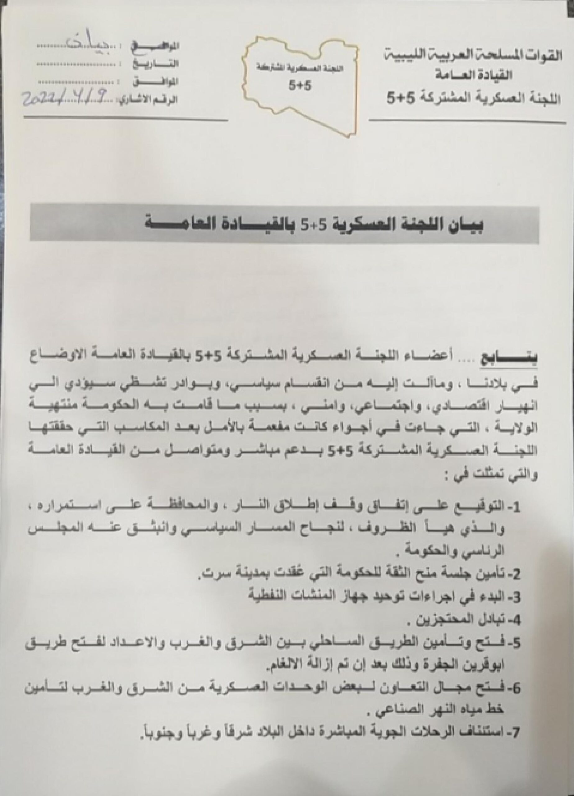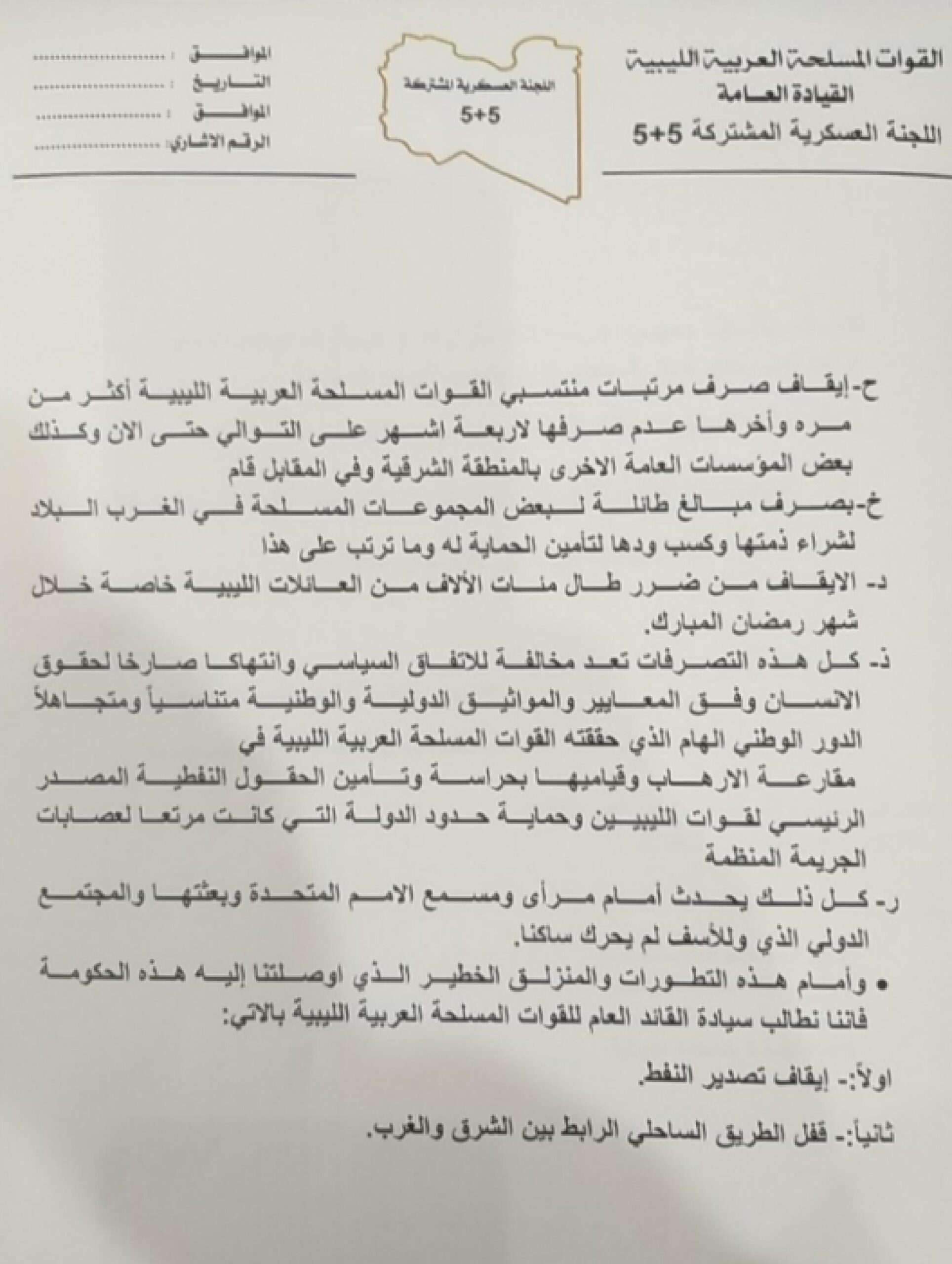 Members of the 5+5 Joint Military Committee has called on Khalifa Haftar, leader of the Libyan National Army (LNA), to take drastic measures with the goal of enforcing a blockade on the government of Abdul Hamid Dbeibeh.