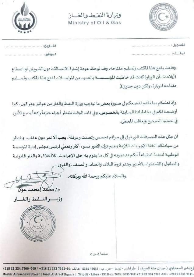 Libya’s Oil Minister Mohamed Aoun has accused the National Oil Corporation (NOC) of deliberate disruption of the wireless communications in his ministry, according to a leaked document.