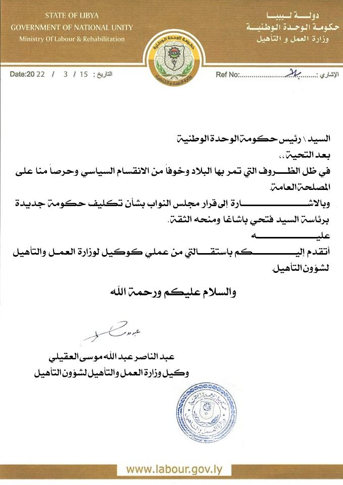 Nasser Al-Aqili, Undersecretary of the Ministry of Labor, announced on Tuesday his resignation from the government of outgoing premier Abdul Hamid Dbeibeh.
